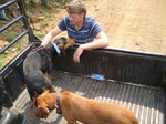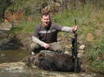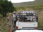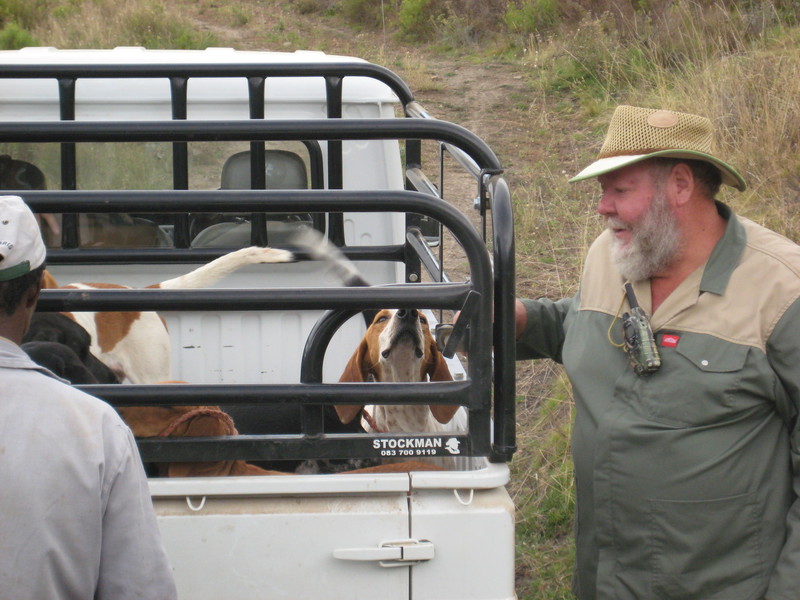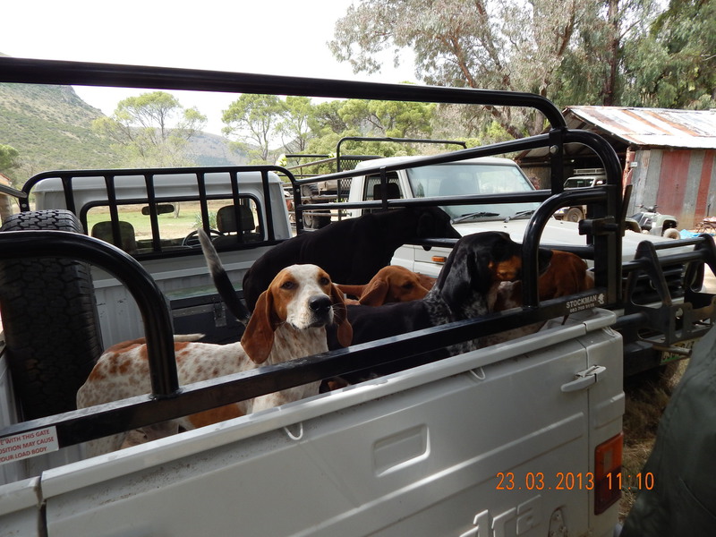 Eine weitere Möglichkeit ist die Jagd mit einer Hundemeute. Ein befreundeter Farmer und PH hat eine solche Hundemeute, mit der er Buschschweine jagt. Wenn wir ihn buchen, kommt er mit circa zehn ausgebildeten Hunden, die an einem von Buschschweinen angenommenen Luder angesetzt werden und der Spur folgen. Oft liegen die Schweine am Tage in Dickungen oben in den Bergen. Dort werden sie von den Hunden hochgemacht. Die Hunde geben Spurlaut und es ist am Jäger zur Sau zu gelangen. Diese Jagdmethode ist äußerst interessant und eine erfolgreiche Alternative Buschschweine zu bejagen.