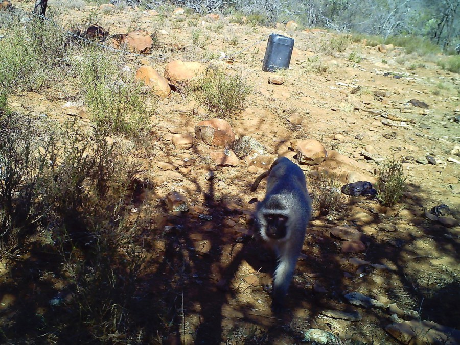 Wenn die Äste in den Baumkronen wackeln und man kleine Äffchen springen sieht, dann handelt es sich um die Grüne Meerkatze. Diese lustigen Gesellen sind schnell unterwegs und inspizieren hier neugierig unsere Wildkamera. Auf dem rechten Bild ist außerdem eine Manguste. Auch diese flinken Raubtiere leben auf der Farm.